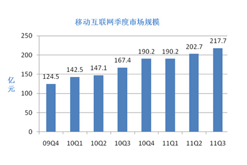 上圖是易觀國際發(fā)布的移動互聯(lián)網(wǎng)的相關(guān)數(shù)據(jù),數(shù)據(jù)截止到2011年第三季度,該圖顯示,2009年全球經(jīng)濟復蘇之后,移動互聯(lián)網(wǎng)業(yè)務收入一直保持著良好的增長狀態(tài),最新數(shù)據(jù)表明,2011年移動互聯(lián)網(wǎng)的整體市場規(guī)模已達到851億,遠超過2010年的637億,增長率將近33.6%,在移動互聯(lián)網(wǎng)業(yè)務子領(lǐng)域中,表現(xiàn)最突出的是移動電子商務,與2009年相比較,移動電子商務所占比例由3%直線增長到11%。但是在手機閱讀和手機游戲方面則表現(xiàn)平平,有較大的增長空間。預計2012年3G用戶規(guī)模將增長到6億,將會超過互聯(lián)網(wǎng)用戶數(shù)量,智能機以及移動互聯(lián)網(wǎng)還會保持或者超過2011年的增長速率。