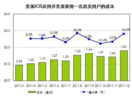 國際著名APP市場營銷組織Fiksu最新的研究數(shù)據(jù)或許能出答案。2011年12月iOS應用開發(fā)者獲得一名忠實用戶的成本達到1.81美元,創(chuàng)下歷史新高。而在2011年第一季度,獲得一名用戶的平均成本為0.94美元,一年間單個用戶成本翻了一倍。當用戶對蘋果商店里花樣繁多的游戲開始麻木,就需要借助有針對性的推廣策略和強大的執(zhí)行,讓產品脫穎而出。如今忠實用戶成本的提高,使得幾乎所有開發(fā)者乃至小團隊都畏懼前期的市場推廣,大中型開發(fā)公司可利用自身的資源循環(huán)造血拉動用戶,越是小的開發(fā)團隊成功的幾率就越渺茫,而被吞并的可能性則大增。