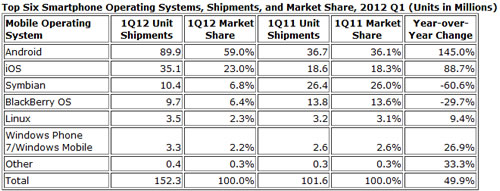 Android和蘋果的iOS繼續(xù)主導(dǎo)全球智能手機(jī)行業(yè),這兩個(gè)平臺(tái)的總出貨量占到2012年一季度所有智能手機(jī)出貨量的82%。其中Android手機(jī)以8900萬臺(tái)占據(jù)整個(gè)行業(yè)出貨量的59%,而蘋果以3510萬臺(tái)的出貨量占據(jù)23%的市場份額。這些數(shù)據(jù)均來自IDC的最新研究報(bào)告。
