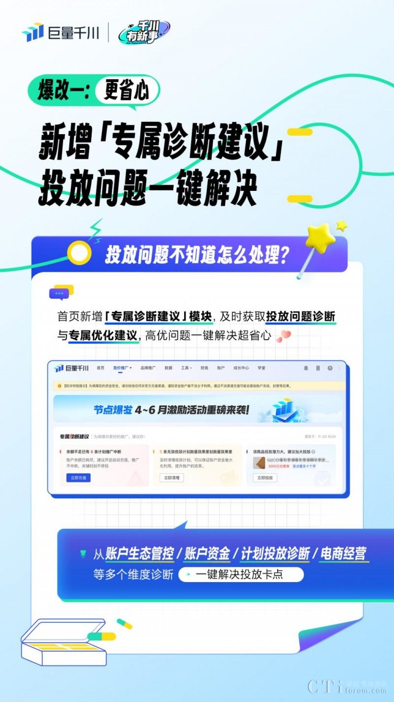 近期,為直面商家投放困境,全面提升投放效率,巨量千川PC端首頁全新推出四大重磅升級(jí)——上線「專屬診斷建議」、「數(shù)據(jù)看板」、「重磅產(chǎn)品推薦」和「平臺(tái)動(dòng)態(tài)」,助力商家更便捷、更從容地提升投放質(zhì)量和效果,高效推動(dòng)生意增長!