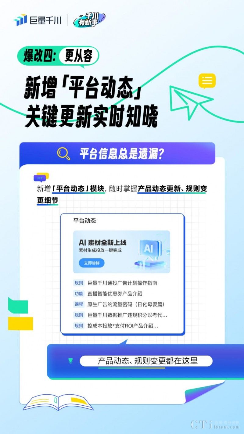 巨量千川首頁升級(jí)還增設(shè)了「平臺(tái)動(dòng)態(tài)」模塊,實(shí)時(shí)呈現(xiàn)平臺(tái)產(chǎn)品更新、規(guī)則變更等信息,讓商家可以及時(shí)了解平臺(tái)最新動(dòng)態(tài),把握生意增長機(jī)遇。