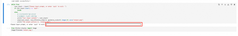 第四步,點(diǎn)擊shift+enter運(yùn)行,運(yùn)行完后在紅框處填寫想生成的圖片文字描述,再點(diǎn)擊 shift+enter 運(yùn)行,就會(huì)出現(xiàn)針對(duì)描述所生成的圖片。