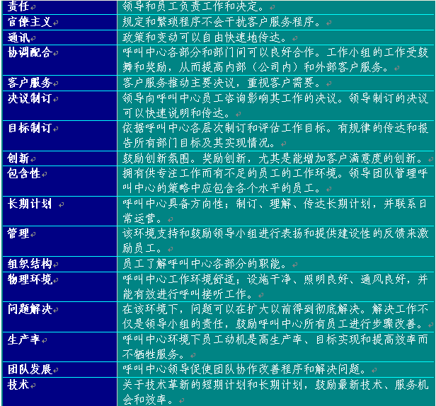 附錄6提供了建議的員工滿意度調(diào)查表?梢宰鳛闇(zhǔn)備制訂呼叫中心使用的版本的起點。在制訂表格時,應(yīng)從所有中心最佳實踐工作和領(lǐng)導(dǎo)團(tuán)隊確認(rèn)的其他部門取得評估要素。表格6總結(jié)了呼叫中心員工滿意度調(diào)查應(yīng)包含的主要方面: