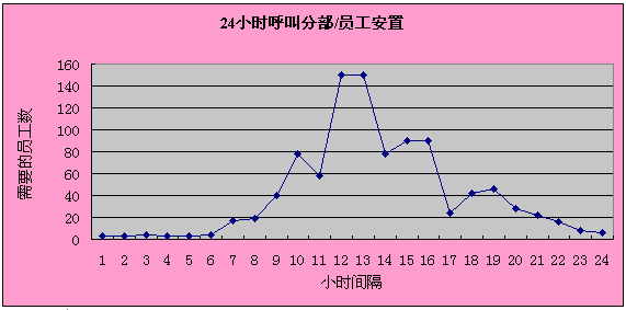 呼叫中心一年中要運(yùn)行365天,也就是說(shuō)每天需要三次8小時(shí)工作替換。一天中員工需求量會(huì)隨著呼叫量高峰期和低估期而波動(dòng)。下面的圖標(biāo)詳細(xì)說(shuō)明了平時(shí)可能需要的變化的員工需求。