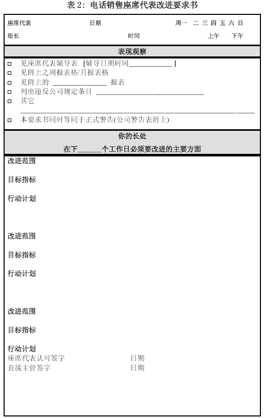 。。這里所列的兩張輔導表應該是主管、質(zhì)檢與輔導師最常見的工具。那種無法對通話內(nèi)容進行具體、詳盡分析,或者輔導人自己也定義不清, 不能給出示范與明確改進方向的管理絕對不是專業(yè)的管理。在這類輔導表之外,可以根據(jù)通話的評價和其它一些紀律觀察,設計一種“改進要求表”,將根據(jù)表現(xiàn)觀察后制定的改進要求詳細列出。如果公司有書面警告一類的程序要求,也可揉合進改進要求書。