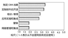 通常,通信提供商相對而言不愿意求助于專業(yè)服務(wù)公司來幫助其實施CRM解決方案。在1~5的標(biāo)尺中,只有積分為5的公司可能使用專業(yè)服務(wù)公司,分?jǐn)?shù)低于3.5的公司沒有一家會這么做,這表明通信提供商仍由內(nèi)部人員來實施多數(shù)功能。調(diào)查的分?jǐn)?shù)表明他們最可能與外部服務(wù)提供商合作制定戰(zhàn)略——定制軟件開發(fā)(3.33)和培訓(xùn)(3.22)。他們最不可能求助此類公司來從事網(wǎng)絡(luò)管理和集成(1.89)或營銷(1.89)工作。圖3顯示的就是這些調(diào)查結(jié)果。