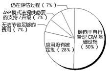 據(jù)圖4顯示,多數(shù)被調(diào)查者目前都沒有依賴ASP,而是由內(nèi)部機構(gòu)來管理客戶管理解決方案。大量的被調(diào)查者聲稱他們不想從ASP那里租用客戶許可證。10%的被調(diào)查者表示他們不會與ASP合作實施CRM解決方案。