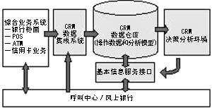 在CRM數(shù)據(jù)倉庫中,實(shí)際數(shù)據(jù)分為操作數(shù)據(jù)和分析模型。操作數(shù)據(jù)包括客戶基本信息、客戶賬務(wù)信息和操作控制(客戶個性化服務(wù)信息)。分析模型包括客戶關(guān)系管理的所有分析模型、市場分析、客戶信用度分析、客戶滿意度分析和銷售行為分析。因此,CRM的主體部分將通過數(shù)據(jù)集成系統(tǒng)與業(yè)務(wù)處理部分(綜合柜面系統(tǒng)等)和客戶聯(lián)系部分(呼叫中心等)連接起來。同時,由于業(yè)務(wù)處理部分一般都采用銀行的現(xiàn)有系統(tǒng),而呼叫中心則可以成為一個相對獨(dú)立的模塊,因此,銀行CRM系統(tǒng)的實(shí)施主要體現(xiàn)在CRM數(shù)據(jù)集成系統(tǒng)、CRM數(shù)據(jù)倉庫、CRM決策分析環(huán)境、基本信息服務(wù)接口等四大部分。