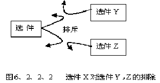 選件的排除關(guān)系是指在產(chǎn)品配置時,選擇了一件就不能選擇另外一件或多件。比如在旅行社在組團時規(guī)定,如選擇了酒店A,就無法選擇組件交通工具中的選件火車,因為酒店A離火車站太遠。圖6、2、2、2說明了這種關(guān)系。