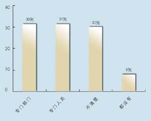 在問到實施周期上,有9家表示希望在3個月內(nèi)完成,占到47.4%,有6家接受3~6個月的周期,超過6個月的周期已經(jīng)顯得太長。在問到CRM的實施效果上,有9家認為對公司運營效率有很大提高,8家認為作用一般,只有2家認為沒有作用。表明基本上企業(yè)認可CRM的作用。在問到是否有專門人員負責CRM時,有6家表示有專門部門,有6家有專門人員,合計占62%,說明企業(yè)非常重視CRM的應(yīng)用。