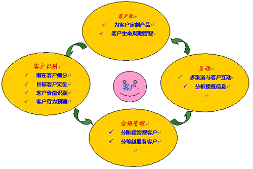 流程涉及到客戶生命周期管理、知識管理的流程。具體來說,流程涉及到兩大方面,其一,CRM成功實施后的企業(yè),應該在業(yè)務流程上一個變革。企業(yè)各個部門開展業(yè)務的共同前提是:以客戶為中心。其二,企業(yè)應當通過CRM來建立一種客戶管理的優(yōu)化流程,從客戶識別,到分級管理,再到企業(yè)與客戶互動,再到為客戶定制產品;然后循環(huán)往復。具體我們可以參見下圖: