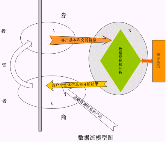 如數(shù)據(jù)流和服務模型圖所示,B模塊就是對客戶進行數(shù)據(jù)分析和數(shù)據(jù)挖掘的模塊。這個模塊將會對領(lǐng)導決定支持和為下一步真正的為核心客戶提供更有針對行的服務提供基礎。