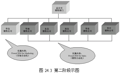 這一階段首先確立一個點(華北銷售公司),這個點的選擇要考慮多方面的因素,比如員工素質(zhì)、電腦應用水平以及基礎設施等。第一階段目標的實現(xiàn)對整個項目關系重大,是一個示范性的實施,對維持管理層和員工對CRM項目的信心具有重要的意義。