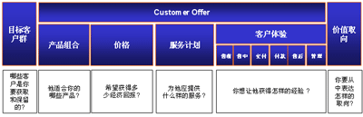 Customer Offer, 以細分的目標客戶價值取向為導向, 其包含符合目標客戶群需求的產品或服務, 符合企業(yè)對該目標客戶價值回報的定價, 以及符合目標客戶群行為習慣的客戶體驗. 往往由專門的CRM功能部門(可為虛擬部門)來負責設計, 協同戰(zhàn)略, 市場, 研發(fā), 銷售和服務等部門共同完成. 其模型如下:
