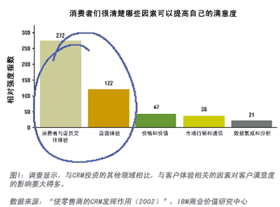 IBM商業(yè)價值研究中心的一項研究結果印證了筆者的設想。IBM 對美國10家零售商的消費群進行了調查,其中包括5家表現(xiàn)較好的(過去3年中在店面單位面積銷售和凈收入的增長方面做得很好)和5家表現(xiàn)較差的(業(yè)績持平或出現(xiàn)下滑)。調查發(fā)現(xiàn),領先的零售商能夠同時有效使用關鍵的滿意度推動因素和關系要素,為消費者提供最佳的“總體體驗”,即一家公司(或一個品牌)有形、無形地給客戶留下的總體印象。該項調查的統(tǒng)計分析結果發(fā)現(xiàn)了5組滿意度推動因素: