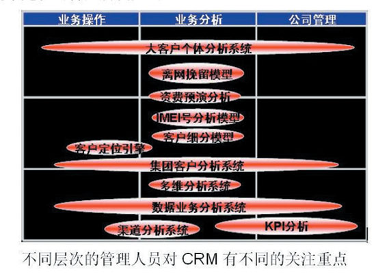 同理,面向大客戶和集團(tuán)客戶工作的大客戶個(gè)體分析系統(tǒng)和集團(tuán)客戶分析系統(tǒng)因?yàn)槠涿嫦蛞粋(gè)部門的特殊性,所以橫跨了業(yè)務(wù)操作、業(yè)務(wù)分析和管理三個(gè)層次。只有將CRM系統(tǒng)的建設(shè)按照模塊化結(jié)構(gòu)化的思路進(jìn)行才能真正滿足用戶的實(shí)際需求和其日常工作與業(yè)務(wù)緊密聯(lián)系起來,使CRM系統(tǒng)發(fā)揮出應(yīng)有的效果。