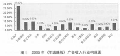廣告客戶在報(bào)紙投放廣告的目的在于說服讀者成為其產(chǎn)品或服務(wù)的消費(fèi)者,他們最感興趣的是向那些最有可能成為其消費(fèi)者的讀者做廣告,而“報(bào)紙讀者與廣告目標(biāo)受眾的相關(guān)性決定了廣告信息是否能夠到達(dá)廣告客戶所希望的人群”。為此,廣告客戶更愿意在其目標(biāo)消費(fèi)群接觸率高的報(bào)紙上投放廣告。由于《羊城晚報(bào)》的讀者群具有學(xué)歷較高、職業(yè)較穩(wěn)定、收入較高、消費(fèi)能力較強(qiáng)等特點(diǎn),因此成為房地產(chǎn)、汽車、電訊、家具等耐用消費(fèi)品行業(yè)塑造品牌的平臺。另外,《羊城晚報(bào)》的讀者以家庭訂戶為主,他們對健康、教育、休閑、娛樂比較關(guān)注,因此醫(yī)藥、文化教育、食品保健品、旅游等廣告在羊城晚報(bào)也占有較大比例(見圖Ⅰ,統(tǒng)計(jì)期間為2005年1月-10月)。
