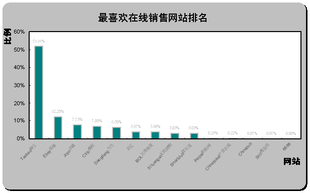 China和貝塔斯曼BOL成為“最不喜歡在線銷售網(wǎng)站”的前兩名,分別有19.77%和18.40%被調(diào)查者選擇易趣和貝塔斯曼作為“最不喜歡在線銷售網(wǎng)站”,兩家網(wǎng)站以相對(duì)較大的比例領(lǐng)先與其他各在線銷售網(wǎng)站。雖然淘寶以巨大的優(yōu)勢成為“最受歡迎的在線銷售網(wǎng)站”,但同時(shí)也可以發(fā)現(xiàn),仍有8.08%的被調(diào)查者選擇淘寶作為“最不喜歡在線銷售網(wǎng)站”,其它“最不喜歡在線銷售網(wǎng)站”比例相對(duì)較大的還有為當(dāng)當(dāng)(7.79%)。