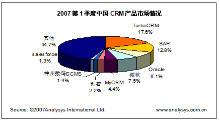 易觀國際研究表明,中國CRM產(chǎn)品市場2007年第1季度總體市場規(guī)模達到0.79億人民幣,同比季度增長率達達到13%,體現(xiàn)了穩(wěn)健增長的趨勢。具體廠商方面,TurboCRM,SAP,Oracle(甲骨文)位居領(lǐng)先地位。