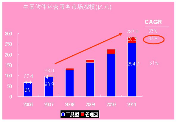 2006中國軟件運營服務(wù)(SaaS)產(chǎn)業(yè)的規(guī)模為68億元,2011年將突破400億,達(dá)到406億元,未來五年的復(fù)合增長率達(dá)到43%。這是國內(nèi)ICT領(lǐng)域權(quán)威研究機構(gòu)計世資訊(CCW Research)在其最新發(fā)布的《軟件業(yè)的下一個十年——中國軟件運營服務(wù)(SaaS)市場發(fā)展趨勢研究報告》中指出的。