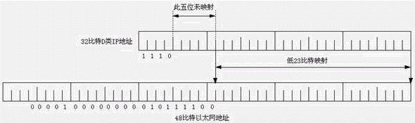 D類地址的最后28比特沒有結構化,即沒有網(wǎng)絡ID和主機ID之分。響應某一個IP多播地址的主機構成一個主機組,主機組可跨越多個網(wǎng)絡。主機組的成員數(shù)是動態(tài)的,主機可以通過IGMP協(xié)議加入或離開某個主機組。IP多播地址影射到以太網(wǎng)地址的方法見下圖。因為IP多播地址的高5位未影射,因此,影射的以太網(wǎng)地址不是唯一的,共有32個IP多播地址影射到一個以太網(wǎng)地址。