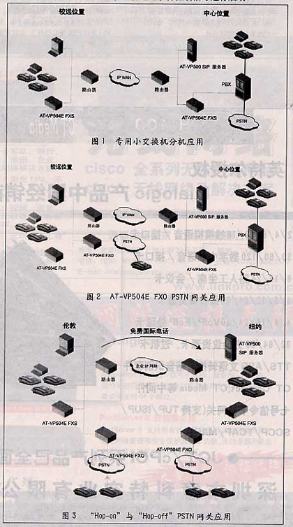 在圖2所示的應(yīng)用中,遠(yuǎn)程局位置直接附加了一個(gè)AT-VP504E FXO裝置,為PSTN提供IP電話(huà)網(wǎng)關(guān)服務(wù),IP語(yǔ)音呼叫被轉(zhuǎn)化為模擬格式通過(guò)標(biāo)準(zhǔn)電話(huà)線(xiàn)路進(jìn)行傳輸。同樣,來(lái)自普通電話(huà)網(wǎng)絡(luò)的呼入呼叫,也被轉(zhuǎn)化為IP呼叫通過(guò)企業(yè)IP網(wǎng)絡(luò)轉(zhuǎn)接。這就使本地PSTN呼叫者,可向企業(yè)或其他目的地打免費(fèi)長(zhǎng)途電話(huà)。