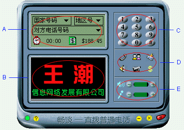 。ㄈ鐖D1)“王潮暢談?wù)Z音全球通”的主界面。A部分是虛擬液晶顯示屏,這里顯示的內(nèi)容與 D(功能鍵區(qū))相對應(yīng),B是廣告位,如果有興趣可以與王潮公司聯(lián)系作廣告(^_^),C是撥號區(qū),D是功能按鈕區(qū),集中了這個軟件的主要功能,E是音量調(diào)節(jié)區(qū)。整個界面簡潔合理。