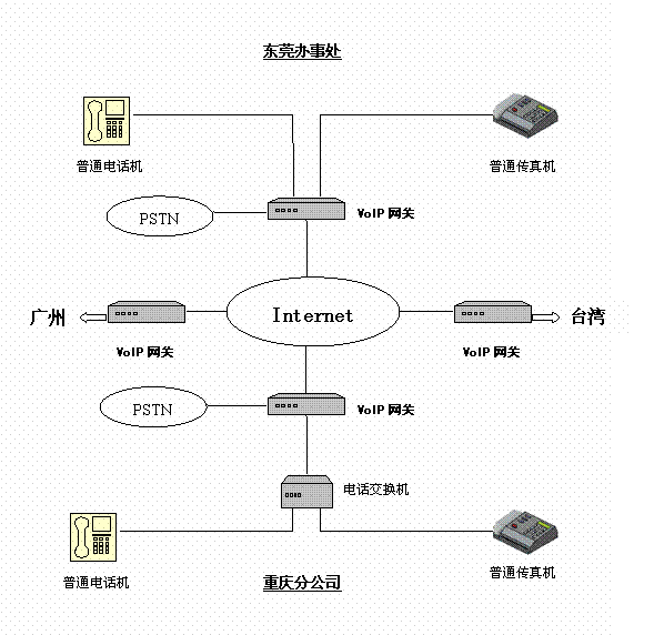 有一家臺(tái)商公司,在臺(tái)灣、東莞、廣州和重慶自己的分支機(jī)構(gòu),相互之間有大量的通話聯(lián)系,特別是研發(fā)部門,其通話量更是非常大。因此試圖在各個(gè)地方之間使用IP電話來降低通訊支出。在實(shí)施IP電話服務(wù)之前,各個(gè)地方都擁有完善的局域網(wǎng),并且申請(qǐng)了固定IP的寬帶接入。并且在辦公室內(nèi)部署了程控電話交換機(jī)。