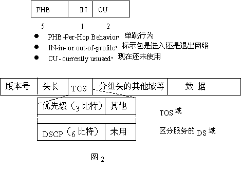 QoS的業(yè)務(wù)區(qū)分結(jié)構(gòu)使用IPV4報(bào)頭中的業(yè)務(wù)類型(TOS)字段,并將8位TOS字段重新命名,作為DS字段,其中6位可供目前使用,其余2位以備將來使用。該字段可以按照預(yù)先確定好的規(guī)則加以定義,使下行節(jié)點(diǎn)通過識別這個字段,獲取足夠的信息來處理到達(dá)輸入端口的數(shù)據(jù)包并將他們正確地轉(zhuǎn)發(fā)給下一跳的路由器。這里需要注意的是在IPV4網(wǎng)中所定義的TOS字段與在Diff-Serv中的DS字段不同。TOS字段的定義如圖2所示。圖IPV4報(bào)頭中TOS字段定義Diff-Serv充分考慮了IP網(wǎng)絡(luò)本身靈活,可擴(kuò)展性強(qiáng)的特點(diǎn),將復(fù)雜的服務(wù)質(zhì)量保證通過DS字段轉(zhuǎn)換為先進(jìn)的單跳行為,從而大大減少了信令的工作。