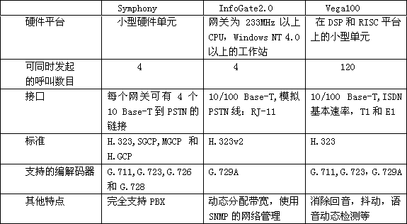 企業(yè)這部分市場與通信公司那部分不同。第一,企業(yè)不需要運載公眾呼叫,因此產品的規(guī)模較小。第二,企業(yè)愿意用連接到公司內部網絡的IP電話產品代替?zhèn)鹘y(tǒng)的PBXs,因此這部分產品必須提供基本的PBX功能,比如呼叫保持和呼叫轉移。表2是一些相關的產品。