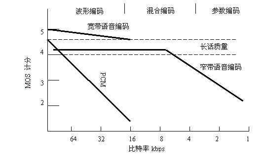 長話質(zhì)量編碼器在比特率高于8Kbps時容易實(shí)現(xiàn),如圖4-2所示。長話質(zhì)量的語音平均意見得分(MOS)必須在分或許分以上。傳統(tǒng)的PCN語音在比特率小于32