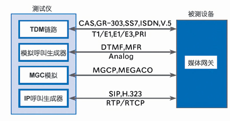 我們按照VoIP組網(wǎng)的原理,構(gòu)建了這樣一個(gè)基本網(wǎng)絡(luò),其網(wǎng)絡(luò)結(jié)構(gòu)如圖4所示。我們用軟交換的概念來(lái)描述網(wǎng)絡(luò)上的設(shè)備,在這個(gè)網(wǎng)絡(luò)上,MG(媒體網(wǎng)關(guān))和MGC(媒體網(wǎng)關(guān)控制器)是關(guān)鍵的VoIP網(wǎng)絡(luò)元素。這些網(wǎng)絡(luò)元素可以是支持H.323、MGCP、H.248或者SIP的實(shí)體。本文中提到的MG和MGC不具體指某一個(gè)設(shè)備,本次測(cè)試正是針對(duì)這兩類(lèi)設(shè)備進(jìn)行,測(cè)試的主要內(nèi)容也圍繞著這兩類(lèi)設(shè)備展開(kāi)。測(cè)試從模擬話音開(kāi)始,然后延伸到PSTN網(wǎng)絡(luò),再到IP網(wǎng)絡(luò),最后回到模擬話機(jī)的被叫方。在這樣一個(gè)完整通話過(guò)程中,測(cè)試MG以及MGC的信令互操作性以及設(shè)備處理信令的能力。圖5是測(cè)試系統(tǒng)結(jié)構(gòu)原理圖。