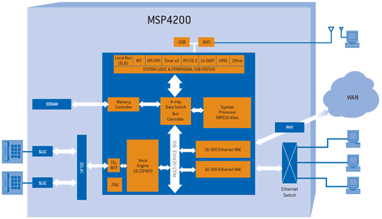 PMC-Sierra VoIP WiFi寬帶路由器方案的核心是MSP4200(見(jiàn)圖),MSP4200支持一個(gè)基于DSP的語(yǔ)音引擎,使得該MIPS處理器在管理、信令和高速I(mǎi)P路由任務(wù)中可發(fā)揮出最佳性能。這種架構(gòu)確保了相當(dāng)于固定線路快速以太網(wǎng)路由速度以及防火墻性能,并能同時(shí)在四個(gè)通道提供VoIP服務(wù)。另外它還有一個(gè)PCI接口以提供更多靈活性,支持各種802.11