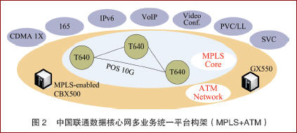 中國聯(lián)通IP電話網的承載網分為核心層和區(qū)域層兩級結構,核心層由北京、上海、廣州、沈陽、武漢、西安和成都7個大區(qū)節(jié)點組成;區(qū)域層按各分公司區(qū)域分布情況,劃分為22個區(qū)域。建網初期,承載網采用ATM+IP/VPN組成IP電話專用傳輸網,確保IP承載層的QoS,網絡性能符合聯(lián)通測試指標。下一階段,中國聯(lián)通數(shù)據(jù)核心網的技術演進路線方向如圖2所示。網絡將以MPLS+ATM為核心技術,在7大核心節(jié)點建設功能強大的MPLS核心網絡,同時采用2層MPLS技術,實現(xiàn)與ATM設備的透明連接,從而構建一個多協(xié)議、多業(yè)務同時兼顧IPv4/IPv6發(fā)展的先進網絡。中國聯(lián)通的互聯(lián)網、數(shù)據(jù)專線、IP電話、視頻會議、IPv6網絡、CDMA1X數(shù)據(jù)通信網等都承載在統(tǒng)一的數(shù)據(jù)傳送平臺之上。