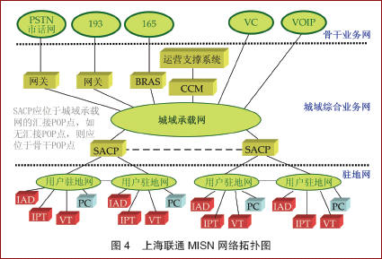 上海聯(lián)通MISN由5個部分組成(見圖4):(1)業(yè)務接入控制設備(SACP)。從用戶駐地網到城域網和骨務都必須通過SACP接的接入認證、業(yè)務接入控制、網絡資源管理和服務質量控制等。(2)呼叫管理控制模塊(CCM)。該模塊負責對用戶注冊的管理;通過SACP對業(yè)務接入進行認證和控制;與骨干業(yè)務網GK互通,完成各種業(yè)務的呼叫控制;與SACP一起采集計費信息;負責控制語音和視頻媒體流的接入。(3)業(yè)務網關。聯(lián)通MISN是基于IP的分組網,與基于電路交換的193長途電話骨干網和本地PSTN市話網互通時,由于媒體層面和控制信令層面都不同,因此,需要通過網關進行互通。(4)BRAS設備。負責將互聯(lián)網接入到165網。(5)業(yè)務運營支撐系統(tǒng)。該系統(tǒng)包括維護網管系統(tǒng)、用戶終端管理系統(tǒng)、用戶管理(業(yè)務受理、用戶信息管理、用戶業(yè)務授權與認證)以及本地MISN的計費/營賬系統(tǒng),其對上的接口是各骨干業(yè)務網的運維支撐系統(tǒng)。