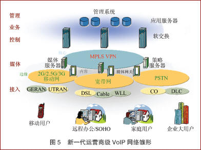 隨著以軟交換和MPLS/VPN兩項技術為核心的下一代網絡技術的不斷成熟和發(fā)展,將構筑起新一代運營商級的VoIP網絡雛形,如圖5所示。