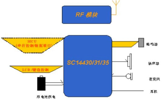 DECT的座機部分可以根據(jù)應(yīng)用,選擇配置采用獨立模式或外接MCU的模式工作,方便用戶靈活擴展功能。外接MCU通過RS232口或SPI口與基帶處理器SC14438/37/35連接,實現(xiàn)控制/數(shù)據(jù)的交互。