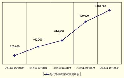 很快時代華納有線的VoIP業(yè)務(wù)就出現(xiàn)了強(qiáng)勁的增長,2005年的頭幾個月,其VoIP用戶數(shù)以幾乎每周1萬的速度增加,到2005年第二季度,時代華納有線就成為全美第二大VoIP提供商。圖1描述了時代華納有線從2004年到2006年初的VoIP客戶強(qiáng)勁增長。