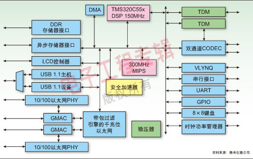 TNETV1051 VoIP處理器集成了300MHz的MIPS處理器、150MHz的C55x DSP、GbE MAC和交換器