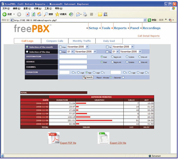 使用Trixbox的統(tǒng)計報告功能(如圖5所示),用戶能夠察看在一個時間段內(nèi)的通話統(tǒng)計數(shù)據(jù),例如呼叫建立總數(shù)、呼叫平均時長、失敗呼叫比例等等,當(dāng)然也能夠察看每個呼叫的主叫/被叫號碼,以及呼叫發(fā)生的具體時間。