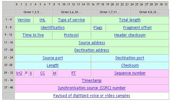 根據(jù)IETF的標(biāo)準(zhǔn)建議,通過(guò)IP網(wǎng)絡(luò)傳輸語(yǔ)音信號(hào)樣本需要增加三個(gè)額外的報(bào)頭,每個(gè)報(bào)頭對(duì)應(yīng)一個(gè)網(wǎng)絡(luò)層次,即IP,UDP和RTP [4]。