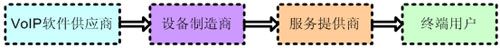 如圖2所示,VoIP產(chǎn)業(yè)價值鏈的各個環(huán)節(jié)包括軟件供應(yīng)商、設(shè)備制造商、系統(tǒng)集成商、服務(wù)提供商及終端用戶。