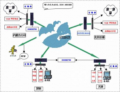 按照西貝公司的要求,ICEFLOW采用FUNCTION口將其普通辦公區(qū)和重要區(qū)域(如財務區(qū))分離開來,進一步保障關鍵數(shù)據(jù)傳輸?shù)陌踩,采用VOIP電話,將為公司節(jié)約大量電話費用。