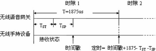 時隙1開始后,語音網(wǎng)關(guān)需要TSTms的時間將射頻芯片從空閑狀態(tài)轉(zhuǎn)換為發(fā)送狀態(tài),當(dāng)轉(zhuǎn)換為發(fā)送狀態(tài)后,預(yù)先存儲在射頻芯片發(fā)送RAM中的信標(biāo)幀立即開始發(fā)送,手持設(shè)備上的射頻芯片在收到六個字節(jié)TSPms后自動鎖存一個當(dāng)前時間timestamp(時間戳),