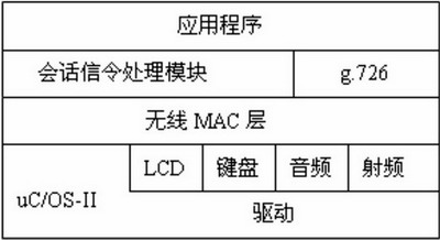 操作系統(tǒng)之上是無線MAC層,該模塊針對語音無線傳輸?shù)奶攸c(diǎn)簡化實(shí)現(xiàn)了IEEE 802.15.4 協(xié)議MAC層功能。第三層為語音壓縮編解碼g.726模塊和無線網(wǎng)內(nèi)部會話信令處理模塊。會話信令處理模塊負(fù)責(zé)處理來自無線語音網(wǎng)關(guān)的會話信令。最上層為應(yīng)用層,實(shí)現(xiàn)用戶界面和通話過程控制。無線手持設(shè)備總統(tǒng)框架如圖6所示。
