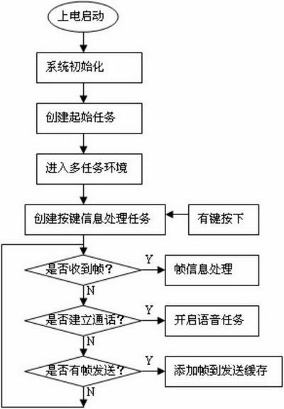 當(dāng)手持設(shè)備上電啟動后,其工作流程如圖7示。首先進(jìn)行的是系統(tǒng)的初始化,包括處理器初始化,操作系統(tǒng)mC/OS-II初始化,LCD,鍵盤,射頻模塊等的初始化。之后建立起始任務(wù)并通過OSStart()函數(shù)進(jìn)入多任務(wù)環(huán)境。此時起始任務(wù)占用CPU資源,在起始任務(wù)中,建立按鍵信息處理任務(wù)并通過信號量機(jī)制掛起。然后判斷是否收到來自無線語音網(wǎng)關(guān)的幀,如果有,調(diào)用frame_deal()函數(shù)處理幀信息,在該函數(shù)中調(diào)用call_command_deal()完成無線網(wǎng)內(nèi)部會話信令的處理。接著判斷通話是否建立,如果建立則創(chuàng)建語音任務(wù),在語音進(jìn)程中使能PCM編解碼芯片,并進(jìn)行g(shù).726壓縮編碼。最后判斷是否有幀需要發(fā)送給無線語音網(wǎng)關(guān),如果有則把幀添加到發(fā)送緩存,等待發(fā)送時隙到來。這一過程完成以后重新跳到判斷是否收到來自無線語音網(wǎng)關(guān)的幀,重復(fù)以上過程。如果有鍵盤中斷,將會釋放一個信號量,該信號量將解掛按鍵信息處理任務(wù)。該任務(wù)對鍵盤輸入信息進(jìn)行處理。