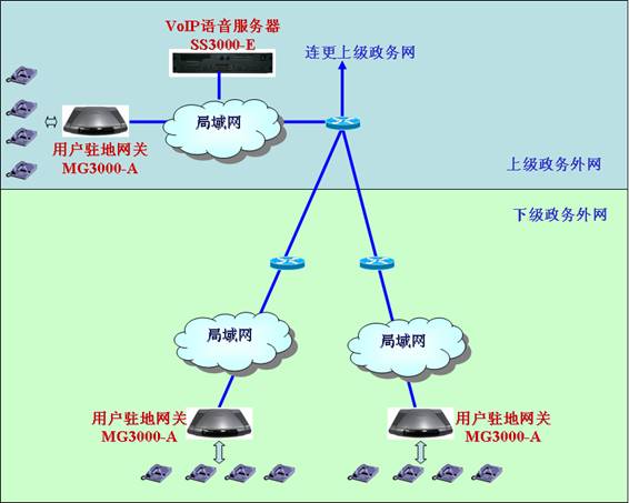 用戶駐地網關是種轉換設備,一端是以太端口連接政務外網,一端是電話端口連接普通電話機。一臺設備的電話端口數目從1、4、8、32不等,可以適應各類應用場合。