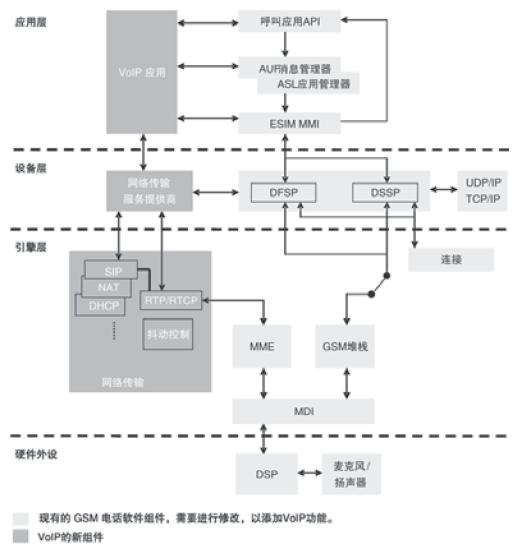 藍(lán)色方塊表示現(xiàn)有平臺的新應(yīng)用,包括網(wǎng)絡(luò)傳輸協(xié)議、核心控制VoIP應(yīng)用。由于支持GPRS功能的每部移動電話都應(yīng)該帶有TCP/UDP