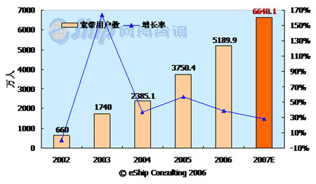 從圖中可以看出,中國(guó)的寬帶用戶數(shù)保持了快速的發(fā)展勢(shì)頭,從2002-2007年年均增長(zhǎng)率為58.7%,至2007年,國(guó)內(nèi)的寬帶用戶數(shù)將達(dá)到6640.1萬(wàn)。