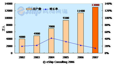 從圖中可以看出,國(guó)內(nèi)即時(shí)通訊用戶數(shù)保持了較快的發(fā)展速度,從2002-2006年年均增長(zhǎng)率為26.6%,到2007年國(guó)內(nèi)即時(shí)通訊用戶數(shù)將達(dá)到1.3億。